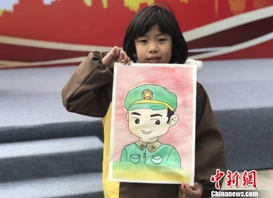 A primary school student displays her painting of Lei Feng, a soldier renowned in China for his generosity and altruistic deeds. [Photo/chinanews.com]